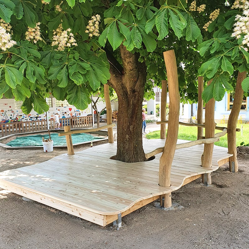 Vor kurzem haben wir für die Evangelische Kindertagesstätte „Kleine Welt“ in Weidhausen (Landkreis Coburg) ein Spielpodest rund um einen Kastanienbaum geplant und gebaut. Wegen der Massivholzbauweise in Robinien- und Lärchenholz kann sich die Kindertagesstätte auf eine langfristige Haltbarkeit und Stabilität freuen. So stärkt das Spielen der Kinder in der Natur deren körperliche Abwehrkräfte und gibt Ihnen auch ein Bewusstsein für die Umwelt, in das sie spielerisch hineinwachsen.